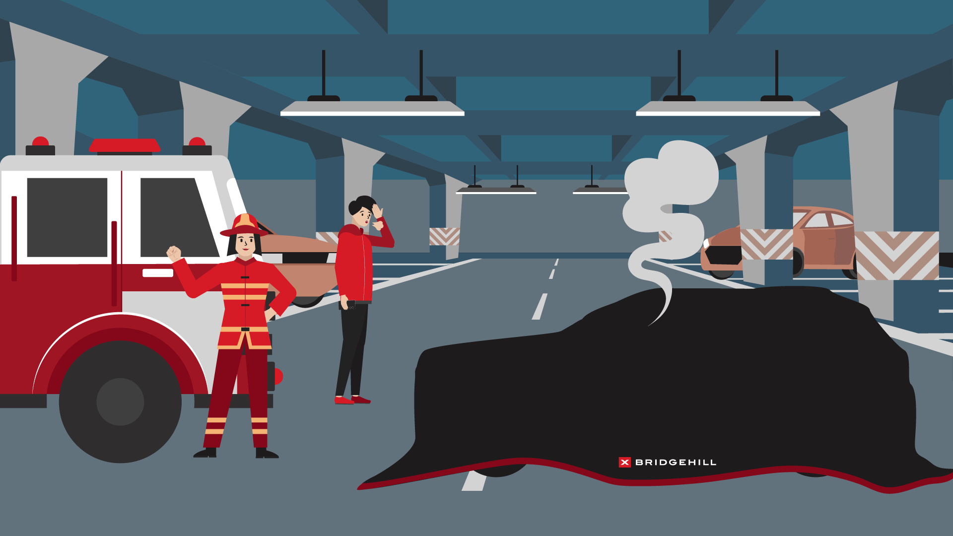 Unsere Bridgehill Brandschutzdecken sind die effizienteste Art, Autobrände zu isolieren und zu löschen, auch für Elektrofahrzeuge.